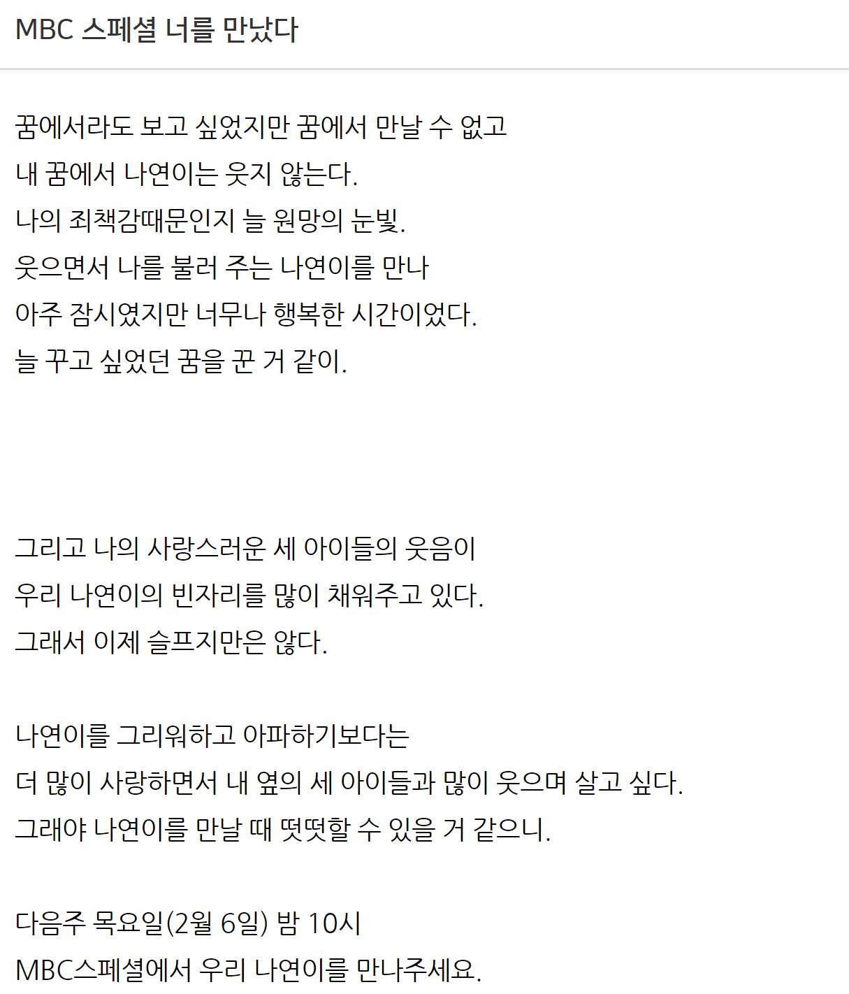 VR휴먼프로젝트를 통해 하루만이라도 다시 만나 나연이가 좋아하던 미역국을 끓여준 뒤 사랑한다고, 한 번도 잊은 적 없다고 말해주는 것. “하늘 보고 대화를 하거나 손을 흔들거나... 어떤 이상한 여자가 하늘에 손 흔들고 있으면 저예요” -엄마 인터뷰 中