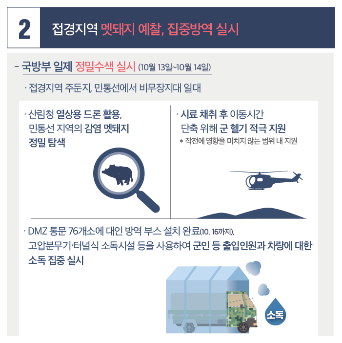 현재까지 환경부는 아프리카돼지열병(ASF) 감염 멧돼지는 총 173마리로 모두 광역 울타리나 민간인출입통제선(민통선) 내에서만 발견이 되었으며, 광역울타리 이남에서 ASF 감염 멧돼지가 포획됨에 따라 강원도는 포획지점 10km 이내 돼지 사육 농가 3곳의 돼지 3060마리에 대한 방역조치와 함께 이동 제한 명령을 내렸다고 합니다.